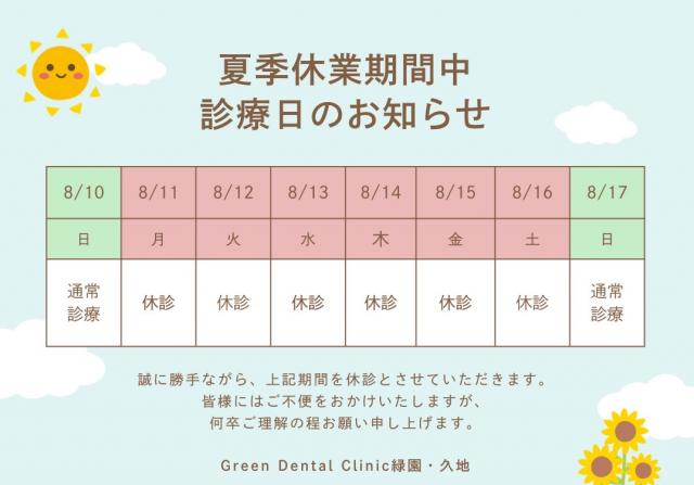 ※8月10日(日)・8月17日(日)は、Green Dental Clinic 久地は通常の休診日