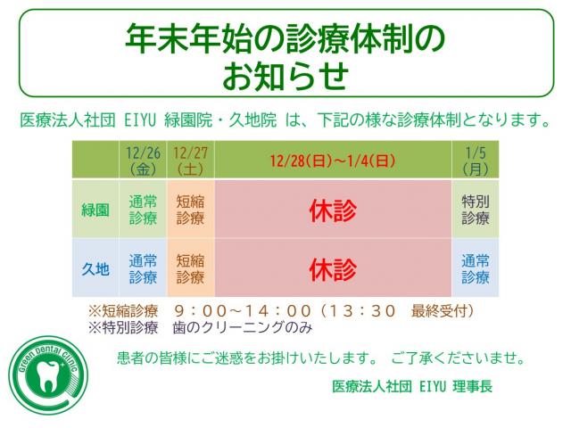 ※短縮診療(9:00~14:00 最終受付 13:30)